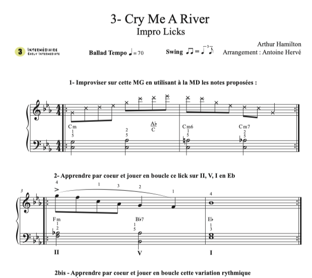 • 1 Partition avec des plans d'improvisation (à transposer), rythmes et accords main gauche (y compris rootless)