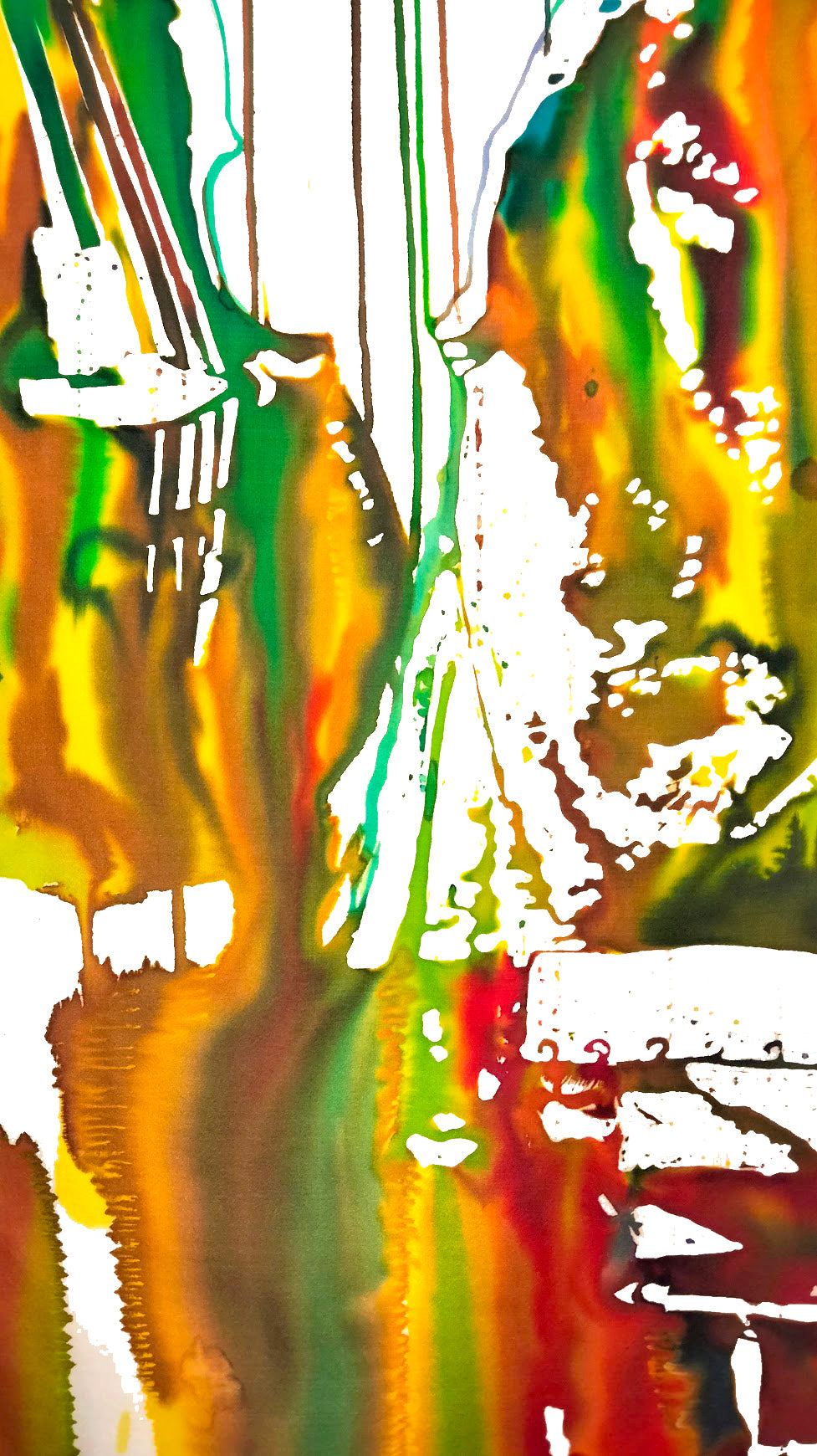 Hedendaagse batik op zijde Afmetingen: 140 cm x 140 cm Tweede performance, live gecreëerd tijdens het concert van het Antoine Hervé trio in Ménilles op 27 november 2025, door Pascale Lef.